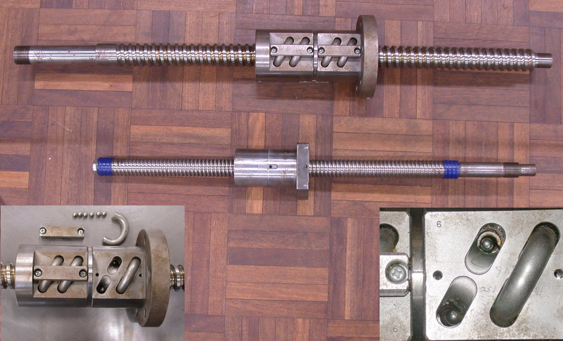 A ball screw is a mechanical linear actuator that translates rotational motion to linear motion with little friction. A threaded shaft provides a spiral raceway for ball bearings which act as a precision screw. As well as being able to apply or withstand high thrust loads they can do so with minimum internal friction. They are made to close tolerances and are therefore suitable for use in situations in which high precision is necessary. The ball assembly acts as the nut while the threaded shaft is the screw.Photo showing two ball screws. Inset images are close-up photos of the ball assembly of the top screw. Left inset: recirculating tube removed showing retainer bracket, loose balls and tube. Right inset: closer view of the nut cavity.Ball screws are used in aircraft and missiles to move control surfaces, especially for electric fly by wire. They are also used in machine tools, robots and precision assembly equipment. High precision ball screws are used in steppers for semiconductor manufacturing.In contrast to conventional leadscrews, ballscrews tend to be rather bulky, due to the need to have a mechanism to re-circulate the balls.